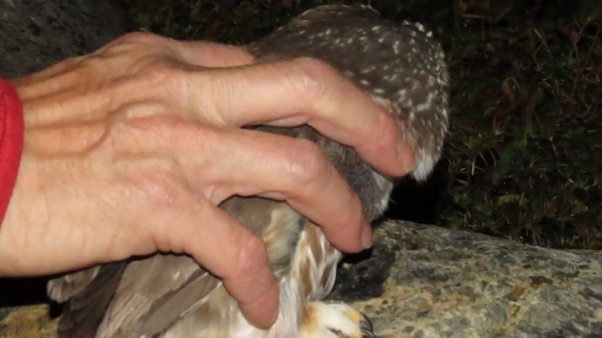The little owl is taken inside where Nina takes a series of measurements, notes observations, and bands the owl before releasing it.