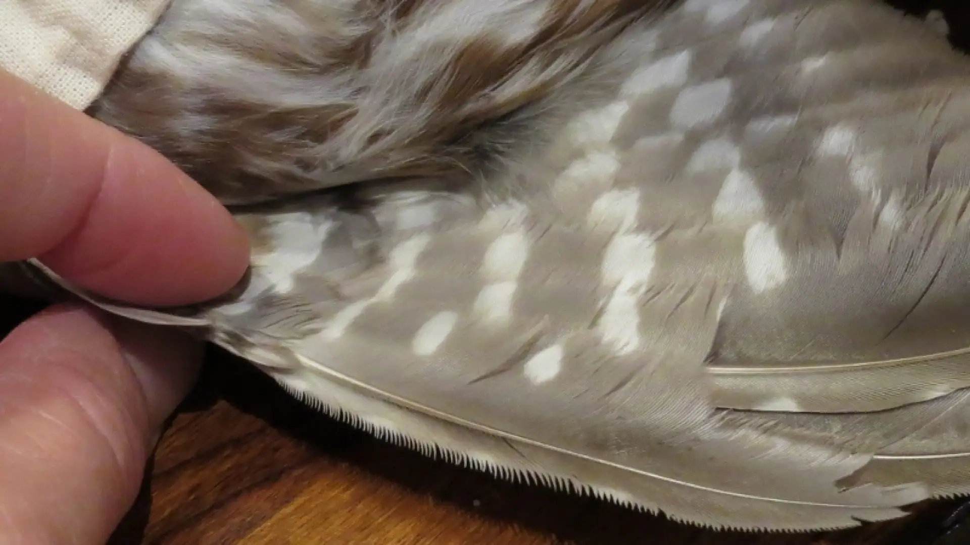 There is a featherless area of skin under the owl’s wing that is observed to determine fat deposits. These deposits show up as yellowish areas and the extent of the fat deposits is ranked on a scale from 1 to 5.