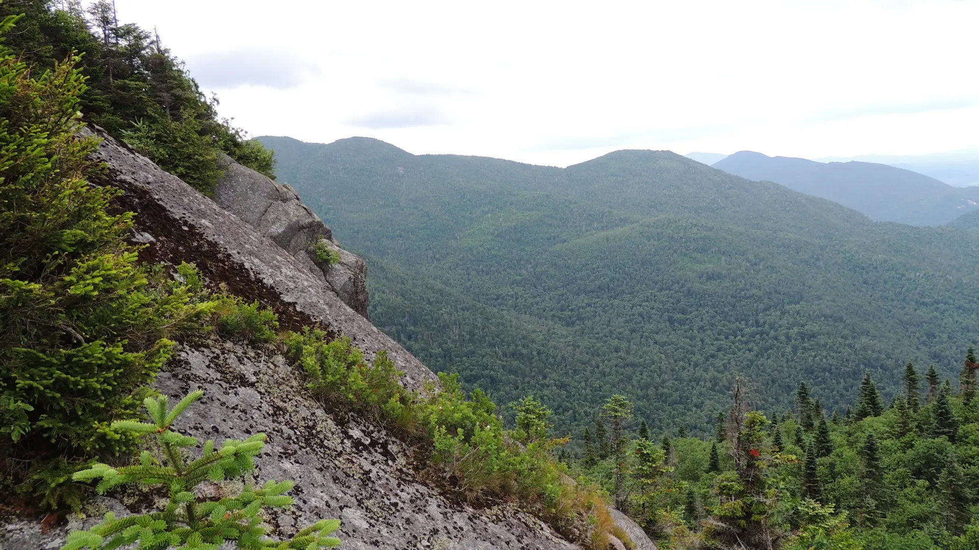 This col was actually pretty tough to move through as the floor was covered in rocks and average-sized boulders, and these solid pieces of unstable earth were also covered in a thick moss and a century of duff. Careful foot placement was in order or the femur eaters would swallow us “hole.” With the help of neighboring trees we pulled ourselves up and to the base of a massive cliff which we would have to negotiate. I had been here before and knew what the protocol was; head left along the base and quickly gain elevation at a very steep pitch. Hugging the cool granite as the water seeped down from the mossy floor above us, we slowly progressed. Keeping close to the rock tends to remove thick tree growth and blowdown from the equation and in this case it is key to ease of travel. Now fully-immersed in the environment we aided each other over the final steep pitch through a narrow gully to a brilliant viewing area.